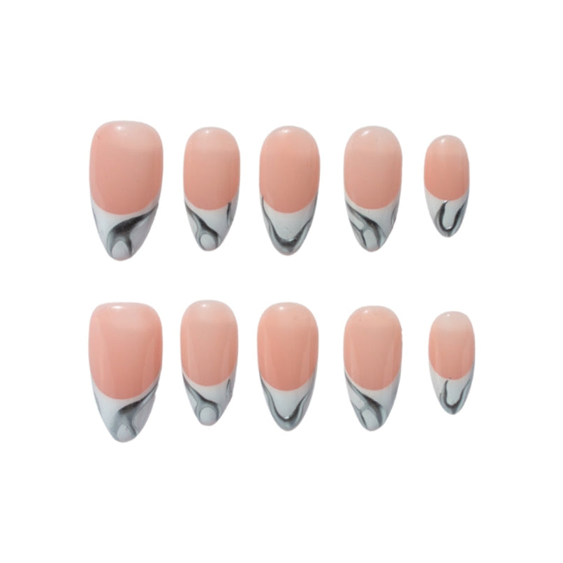 Enhance your nails with these medium almond-shaped press-on nails, featuring a timeless French design with a chic chrome detailing. Perfectly crafted for a sleek, sophisticated look, these nails offer both elegance and durability for any occasion. Easy to apply and remove, these press-ons provide a flawless salon-quality manicure in the comfort of your own home. Get ready to turn heads with the perfect balance of classic style and modern flair!
