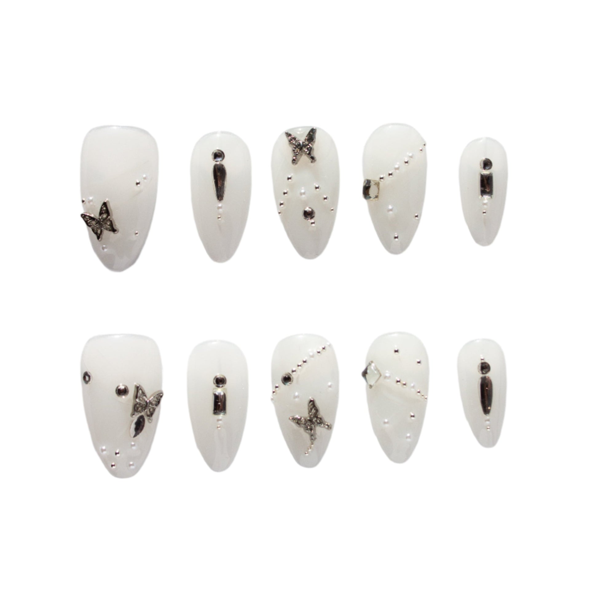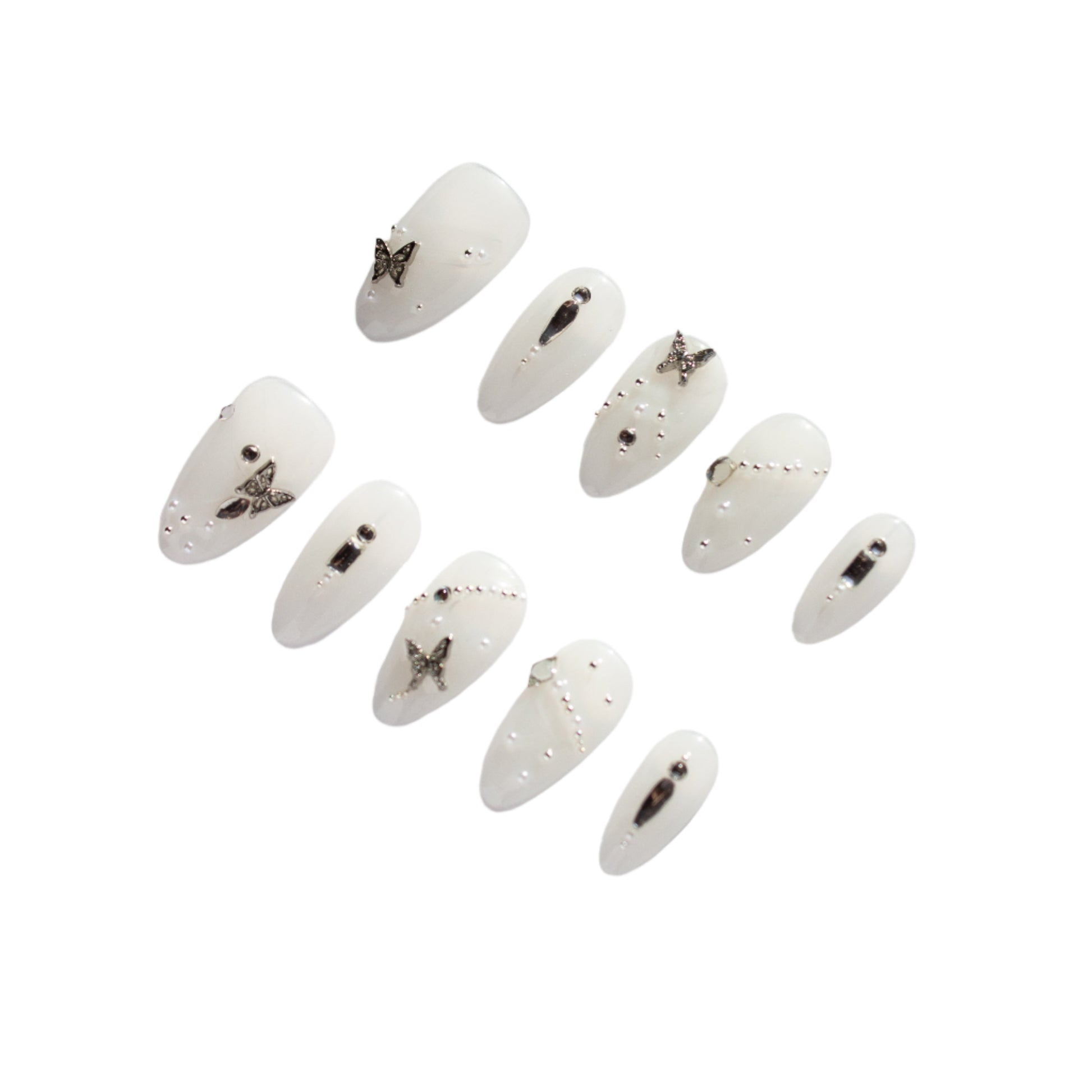 Embrace the elegance of winter with Silver Frost press-on nails. Featuring a pristine glacier white base, these nails are adorned with stunning silver butterfly charms and delicate silver pearl accents, creating a sophisticated, frosty look. Perfect for those who love a touch of sparkle and refinement, Silver Frost offers a graceful, icy elegance that’s ideal for any occasion. Easy to apply and beautifully designed, these nails will make you feel like you’re shimmering in a winter wonderland.