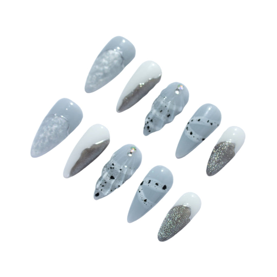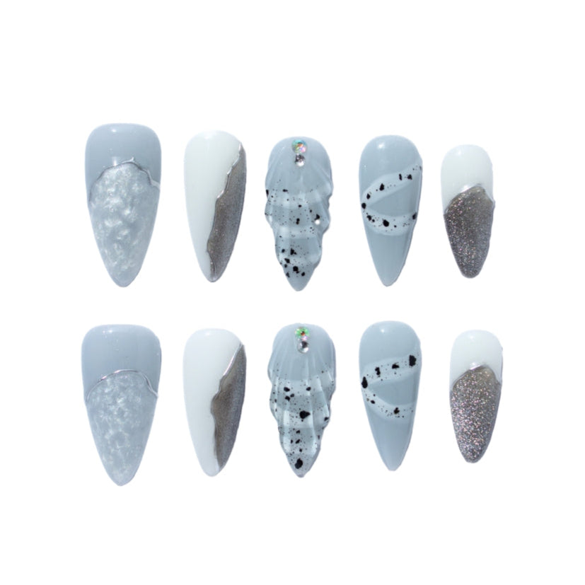 Indulge in the beauty of the sea with our Oceanic Dream Nails, where the calming hues of gray-blue form the perfect base. Adorned with soft waves in white, these nails evoke the gentle rush of the ocean's surf. Accentuated with golden sand and delicate seashells, this design sparkles like the glimmer of sunlight on the water's surface. Perfect for beach lovers and those who adore the serene beauty of the coast, these nails bring the essence of the ocean straight to your fingertips.