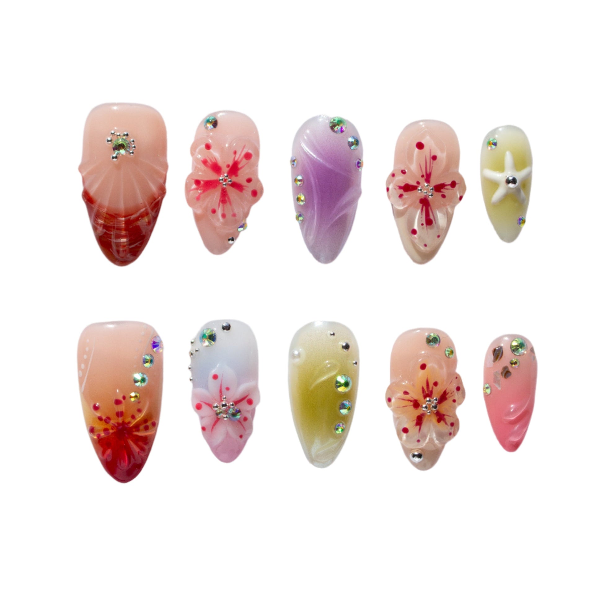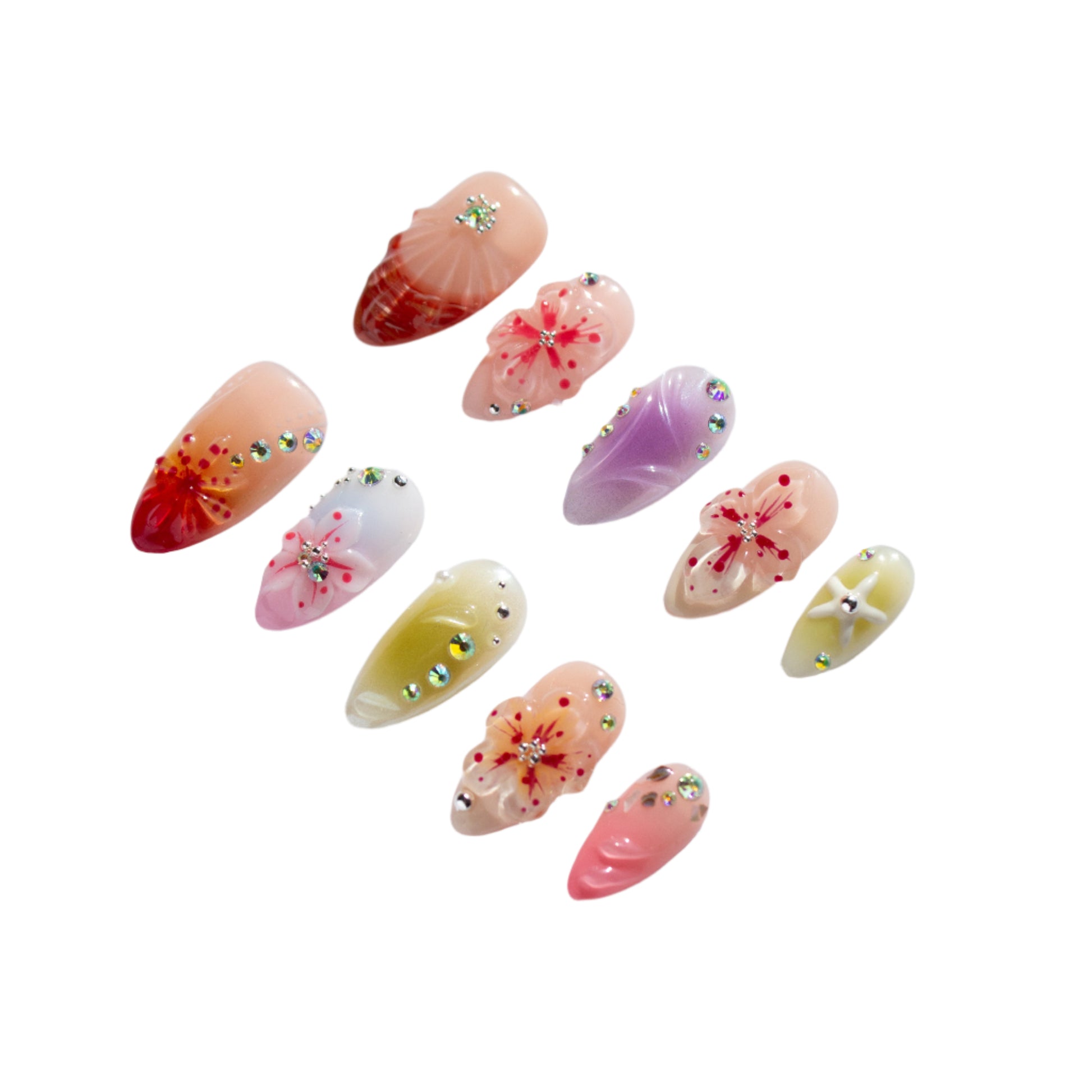 Immerse yourself in the peaceful beauty of the coast with Seaside Serenity press-on nails. Inspired by the calmness of the beach, these nails feature delicate 3D starfish, water flowers, and accents of seashells and corals, capturing the essence of the ocean’s tranquil beauty. The soft, ocean-inspired colors evoke the serene blues and greens of the sea, bringing the soothing energy of the beach straight to your fingertips. Whether you’re relaxing by the shore or embracing the spirit of the ocean, Seaside Serenity offers a perfect touch of coastal elegance.