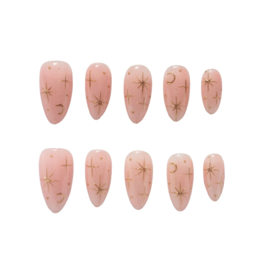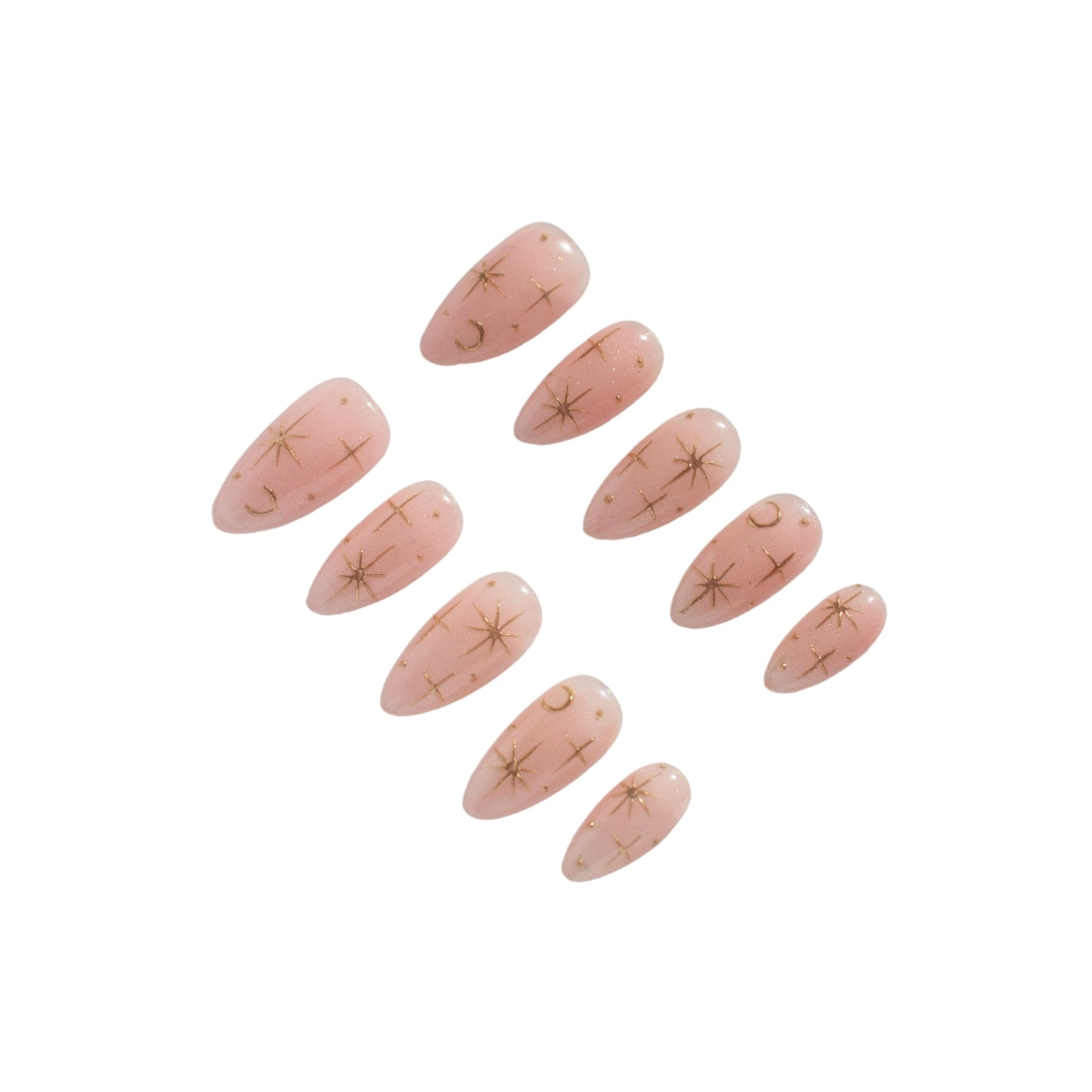 Reach for the stars with Celestial Glow press-on nails. Featuring a soft baby pink base, these nails are adorned with shimmering gold galaxy star accents on each fingertip, creating a cosmic and ethereal look. Perfect for adding a touch of elegance and celestial charm to your style, Celestial Glow effortlessly combines dreamy beauty with a dash of sparkle. Easy to apply and designed to shine, these nails will have you feeling like you’re glowing under a starlit sky.